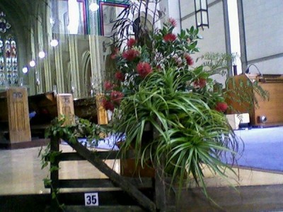 They made a striking arrangement using the red flowers of the rata, contrasting with the dark stems of flax flowers, with other plants, and a clematis trailing over a gate.